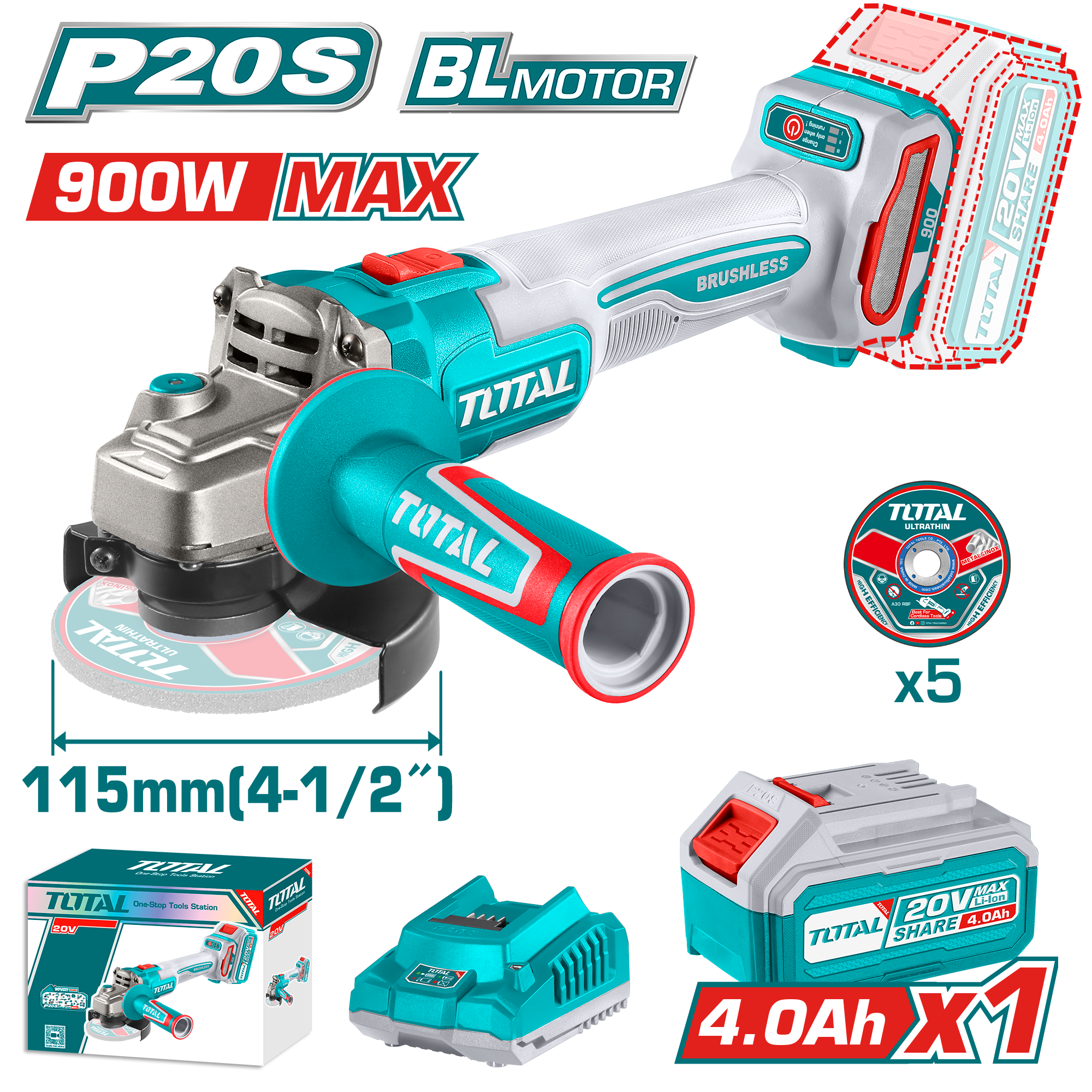 AMOLADORA A BATERIAS 20V 115MM (900W MAX) BL (CAJA CARTON) - BAT/CAR - TAGLI261521 - TOTAL