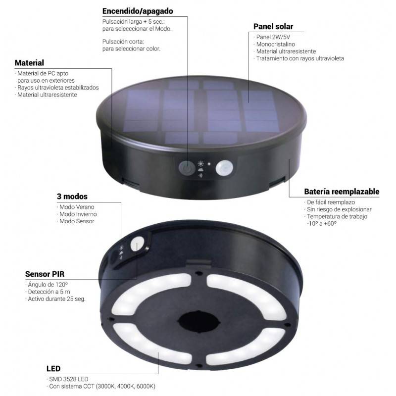 - Tiempo de Carga (Hs): 6 h a 60,000 Lux (día soleado completo)