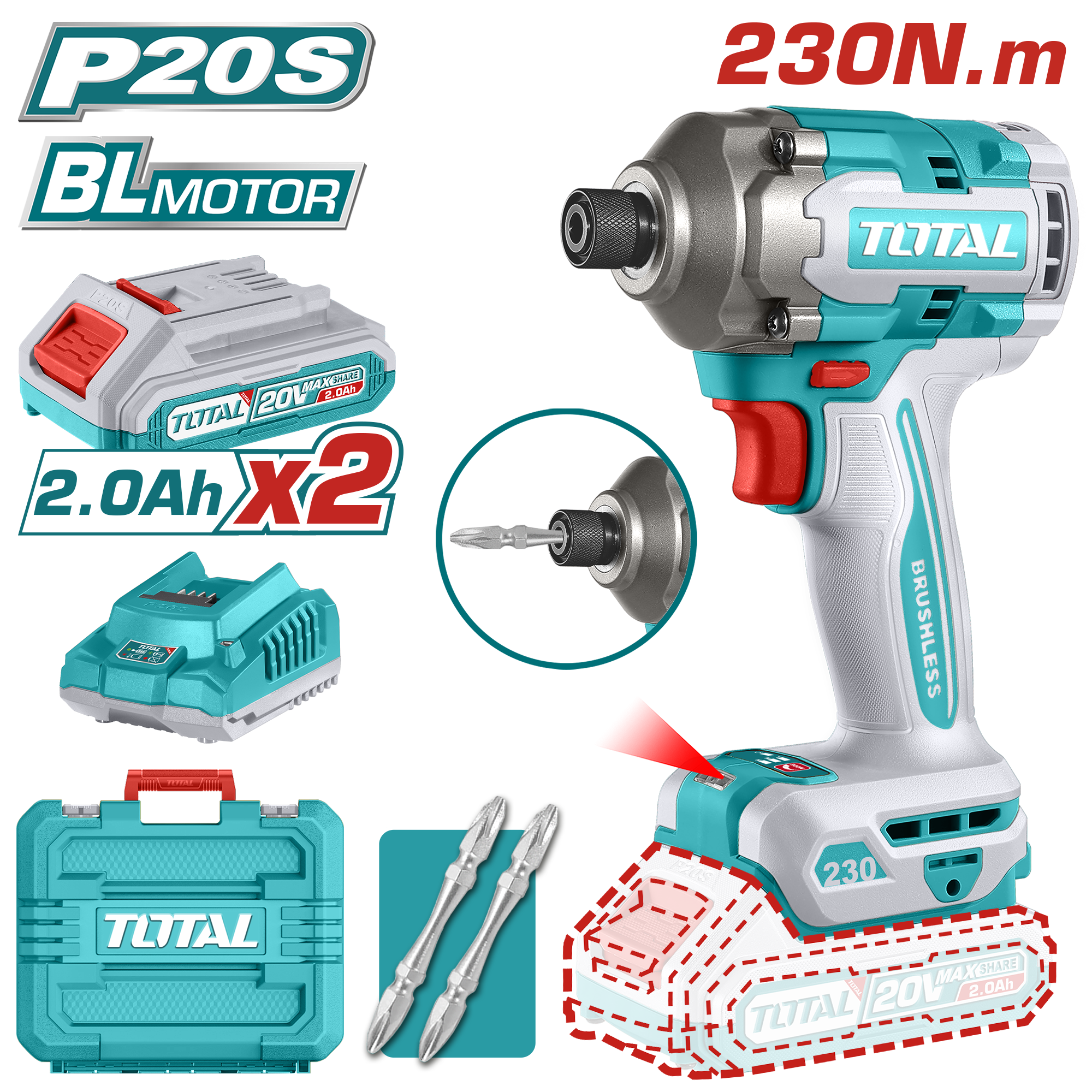 ATORNILLADOR DE IMPACTO A BATERÍA 20V 230NM BL - 2BAT/CAR - TIRLI2023 - TOTAL