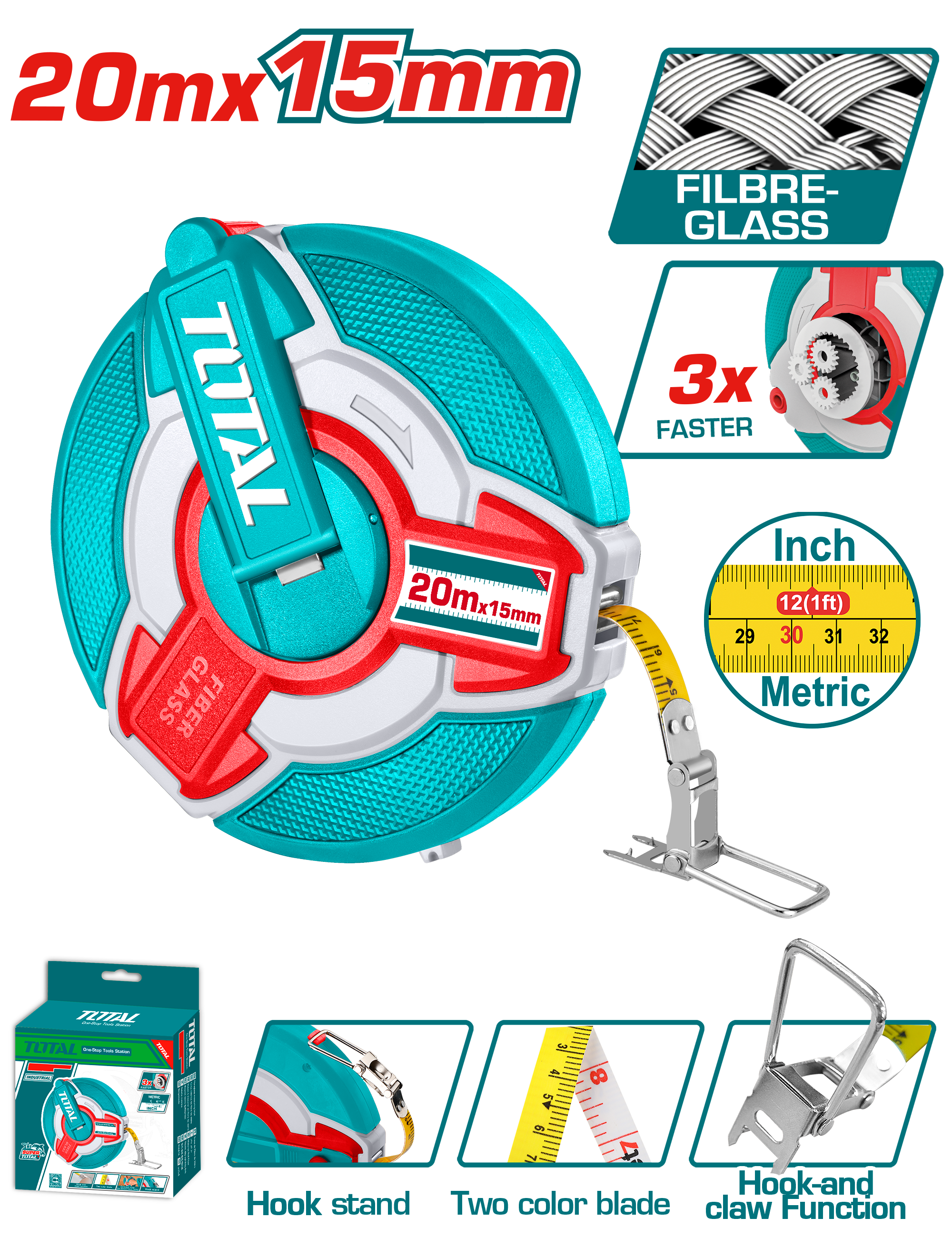 CINTA METRICA DE FIBRA DE VIDRIO 20M X 15MM - TOTAL