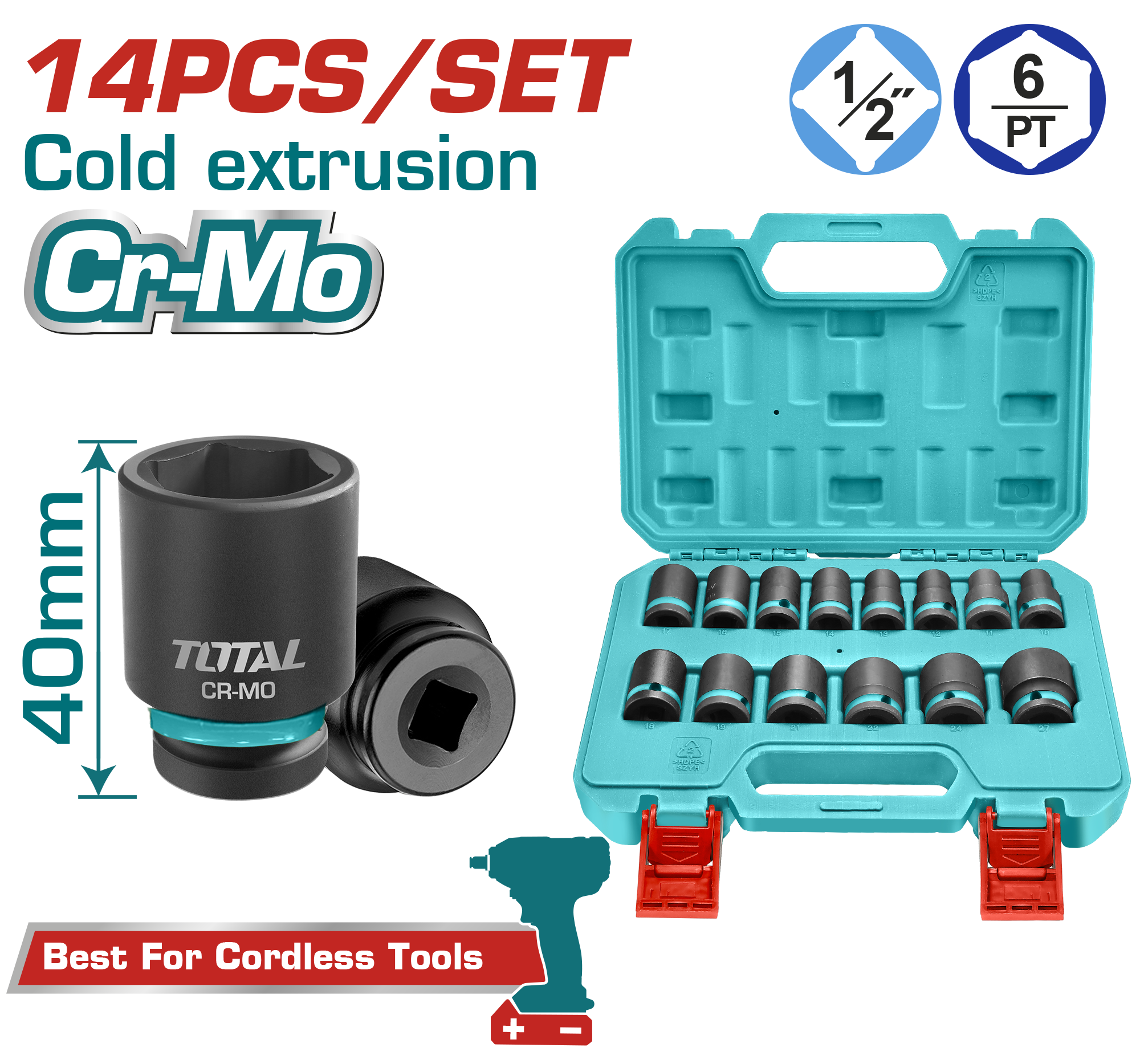 JUEGO DE LLAVES TUBO DE IMPACTO 1/2PULG 40MM (14 PZS) - TOTAL
