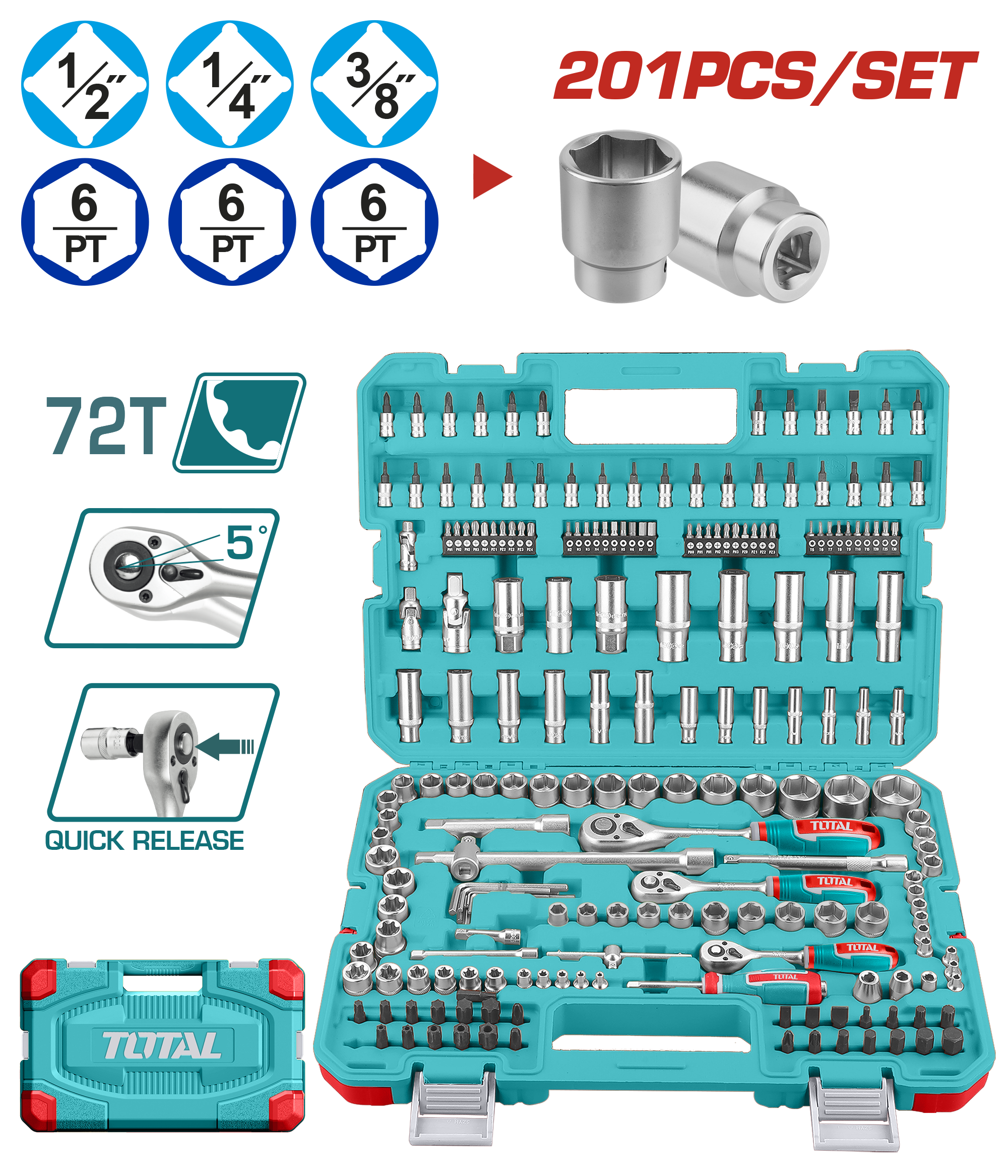JUEGO DE LLAVES Y TUBOS 1/4, 1/2 Y 3/8 PULG. (201 PZS) - TOTAL