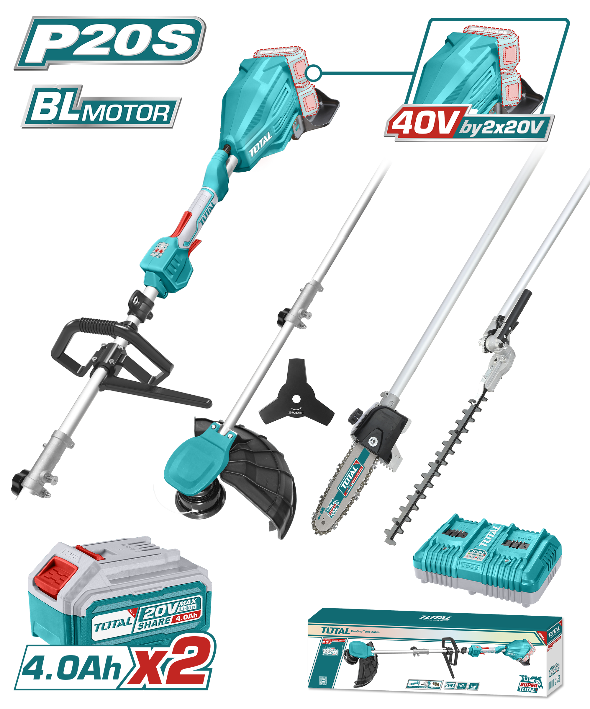 Incluye:1 cabezal de cortadora,1 cuchilla 3T de 255mm, 1 cadena de 8", 1 barra de 8", 1 funda para la barra, 1 funda para la cuchilla de la podadora de setos, 1 correa para el hombro, 2 llaves hexagonales, 2 llaves para bujías, 2 baterías de 4.0Ah,1 cargador de doble puerto