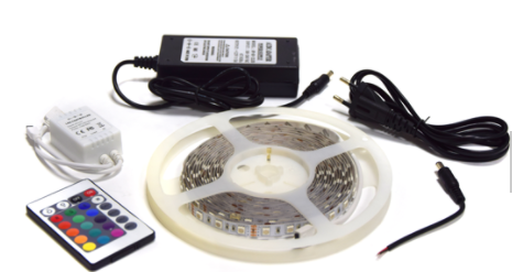 Kit completo, incluye 5 metros de cinta LED, fuente de 2A, conector macho para fuente, controlador RGB y conector hembra.