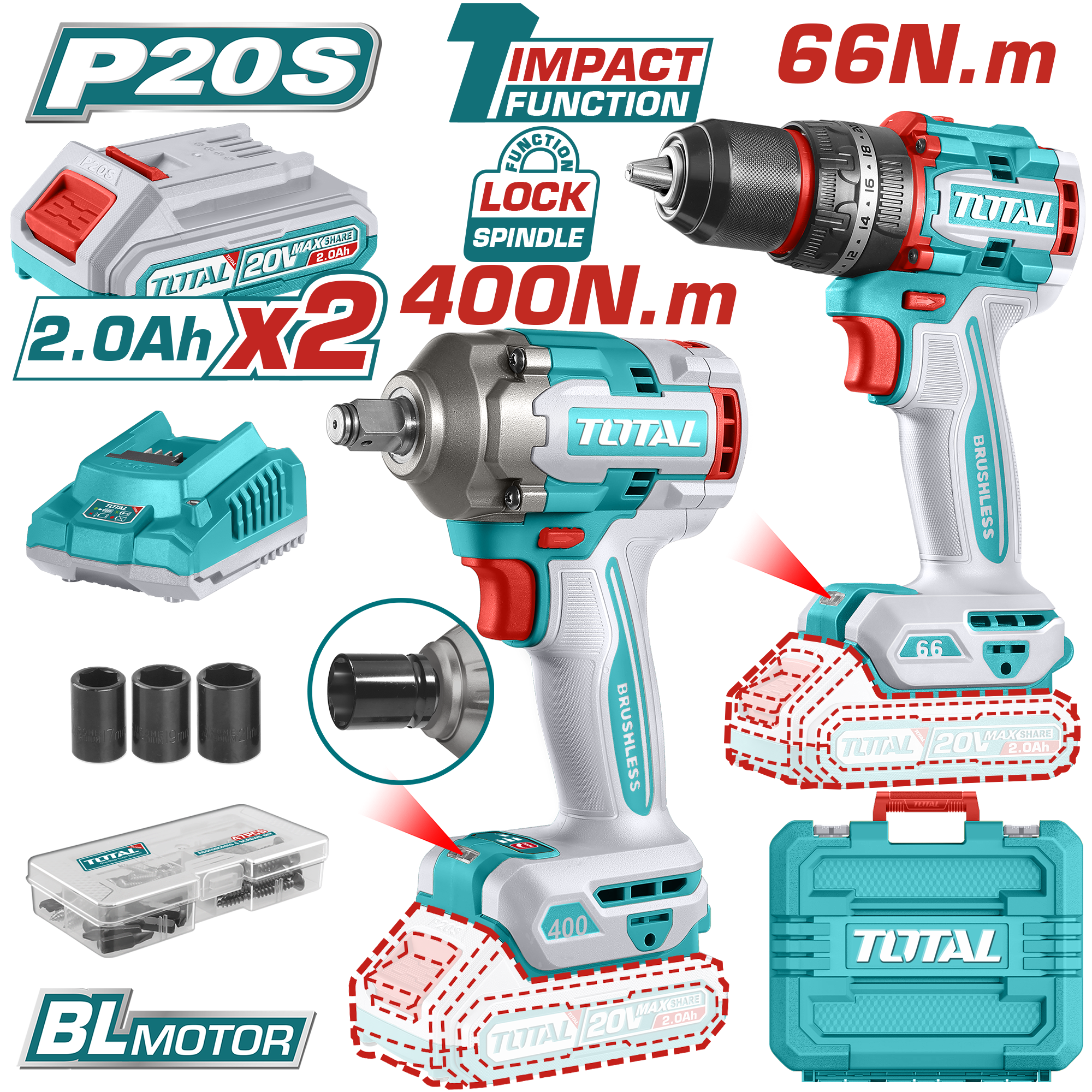 KIT LLAVE DE IMPACTO 400NM Y TALADRO PERCUTOR A BATERÍAS 20V BL - 2BAT/CAR - TCKLI20275 - TOTAL