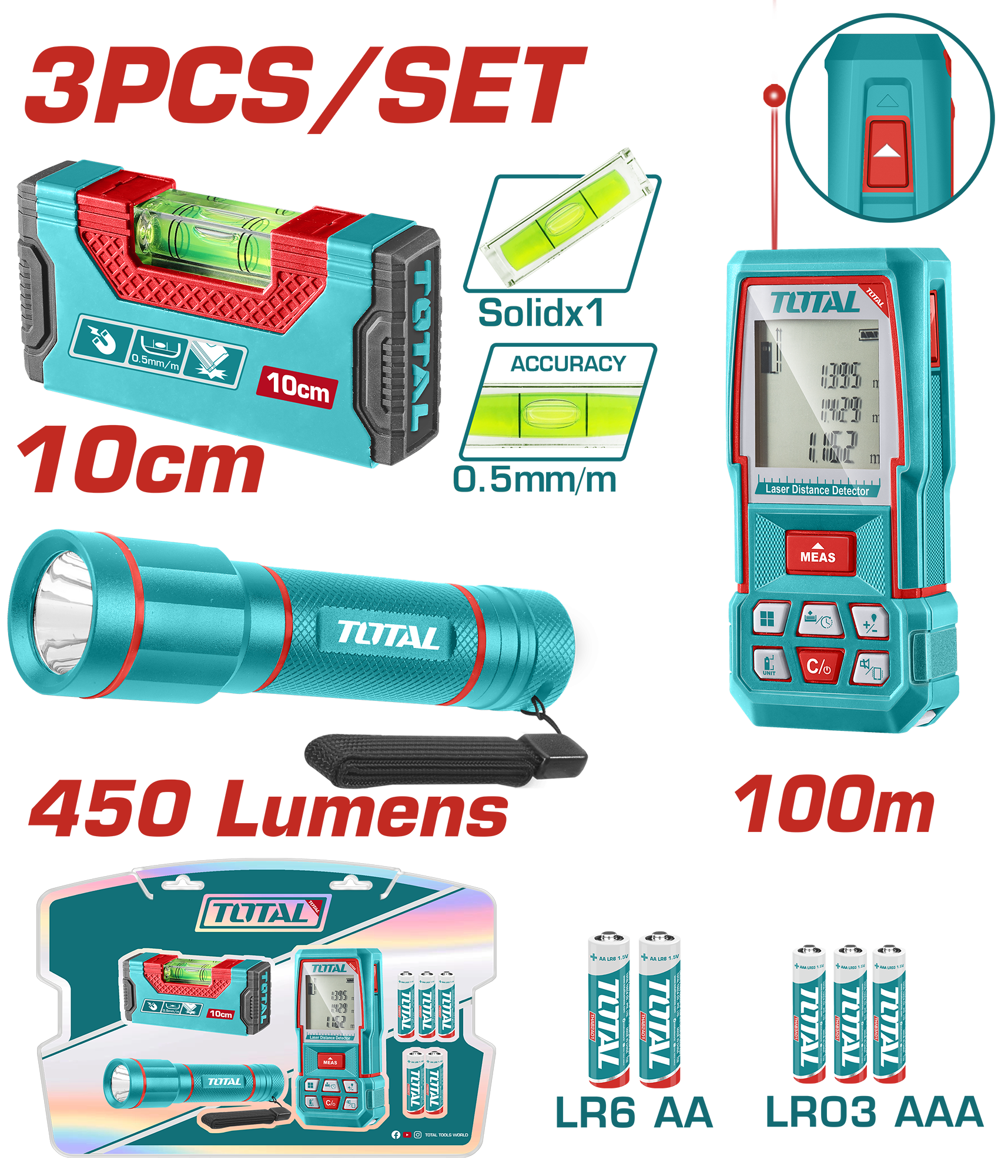 KIT MEDIDOR DE DISTANCIA, NIVEL Y LINTERNA CON PILAS (PROMO) - TOS251003 - TOTAL