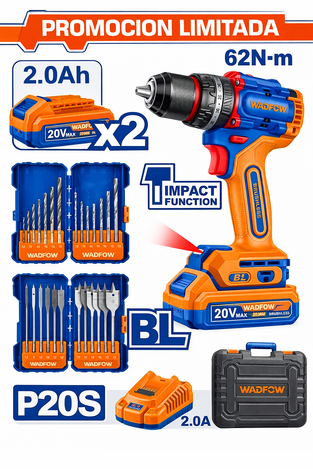 KIT TALADRO PERCUTOR A BATERIA 20V 62NM (C/ ACCESORIOS) - 2BAT/CAR - PROMO - WOS250895 - WADFOW