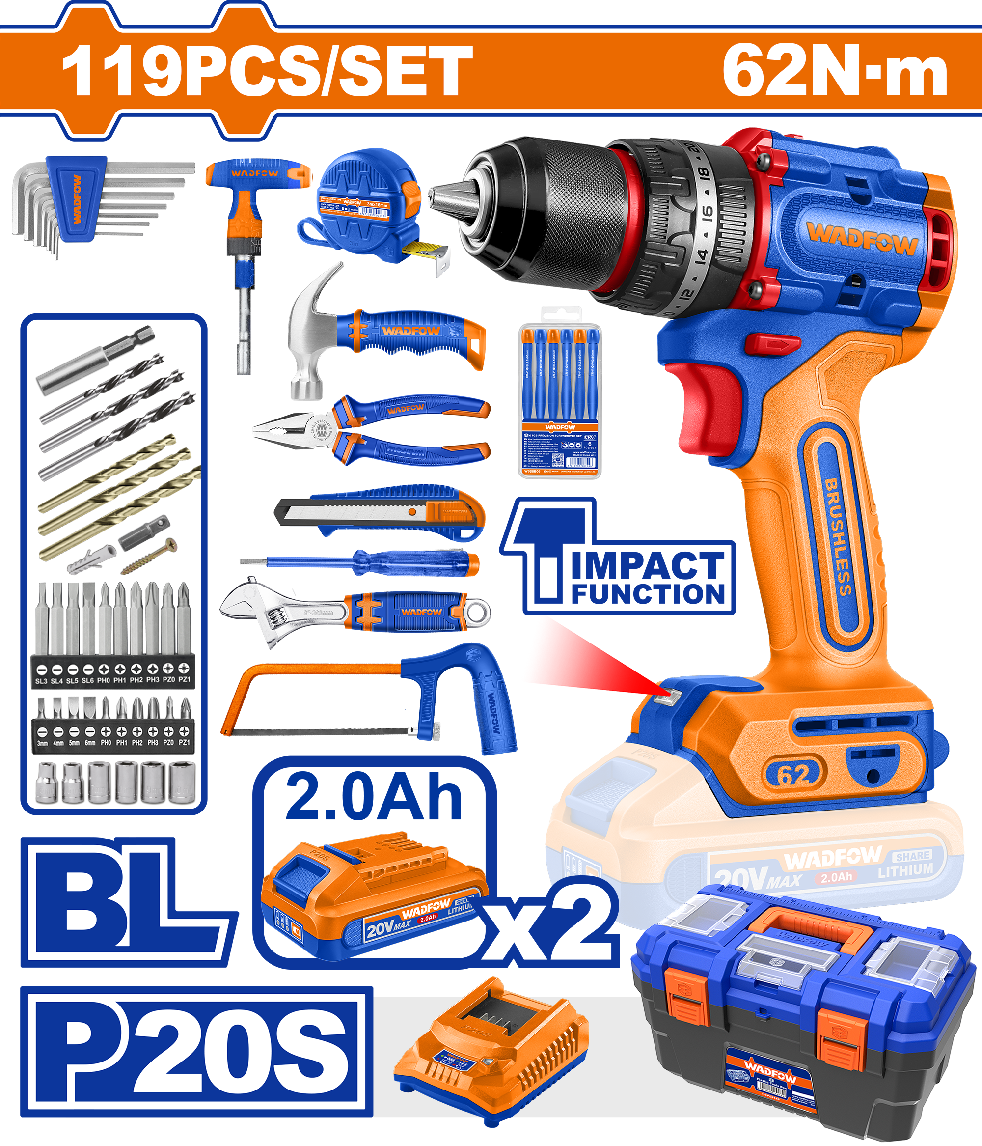 KIT TALADRO PERCUTOR A BATERIA 20V 62NM (C/ JUEGO DE HERR) (119 PZS) - 2BAT/CAR - WDT4B119 - WADFOW