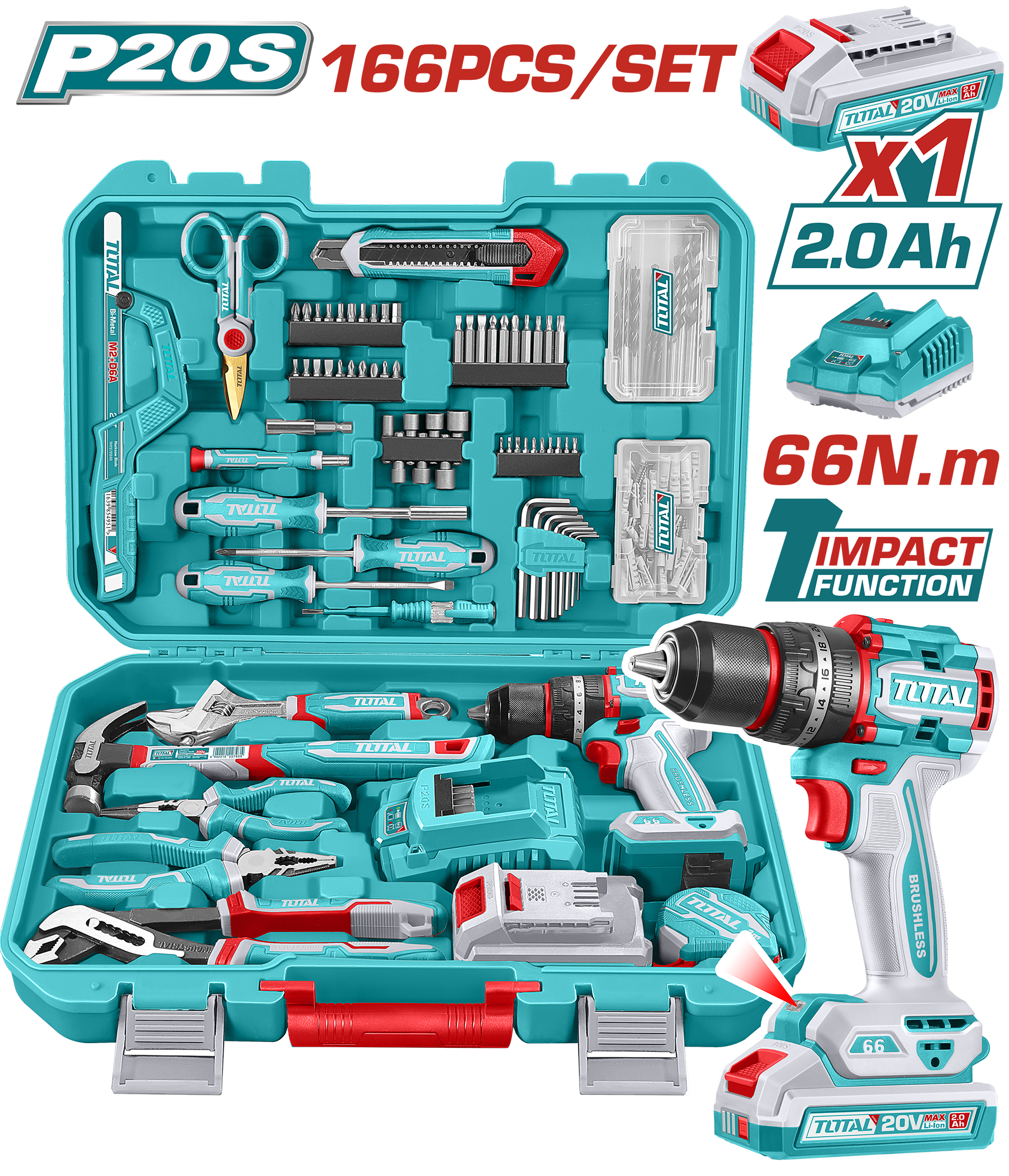 KIT TALADRO PERCUTOR A BATERIA 20V CON JUEGO DE HERRAMIENTAS (166 PZS) - BAT/CAR - TOTAL