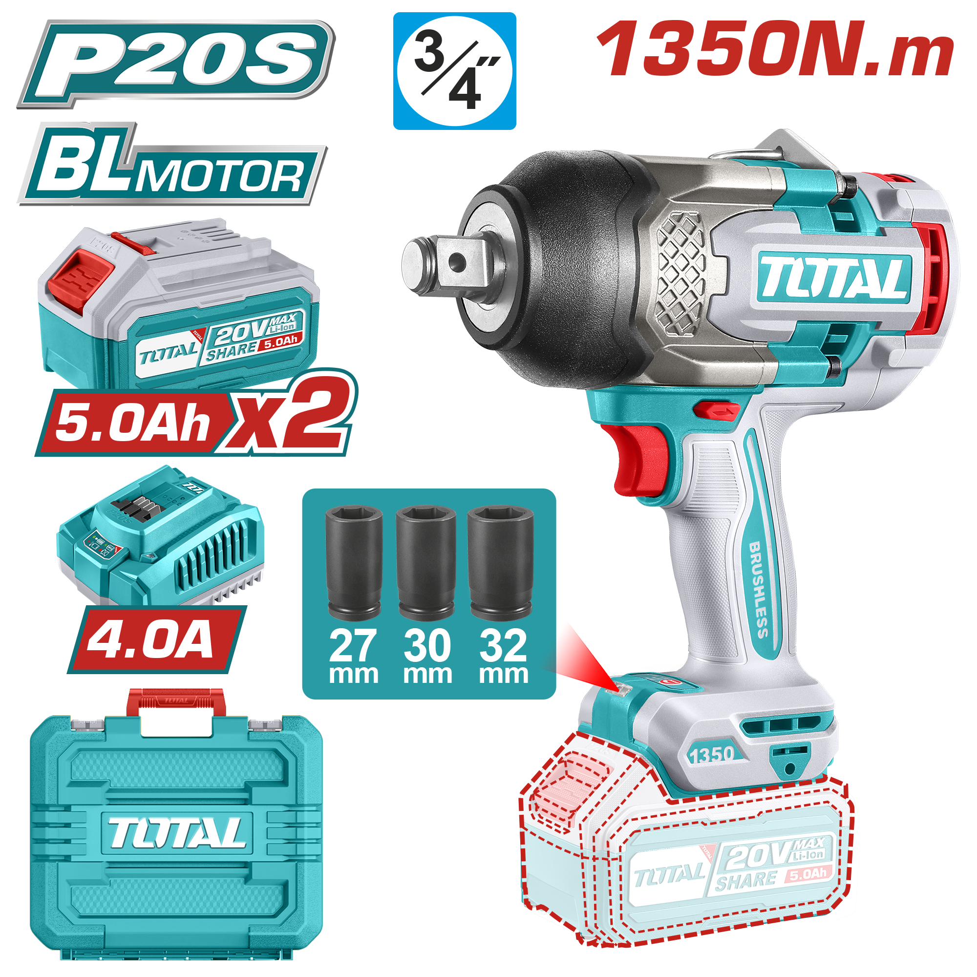 LLAVE DE IMPACTO A BATERIA 20V 1350NM (3/4 PULG) BL - 2BAT/CAR - TIWLI20135 - TOTAL