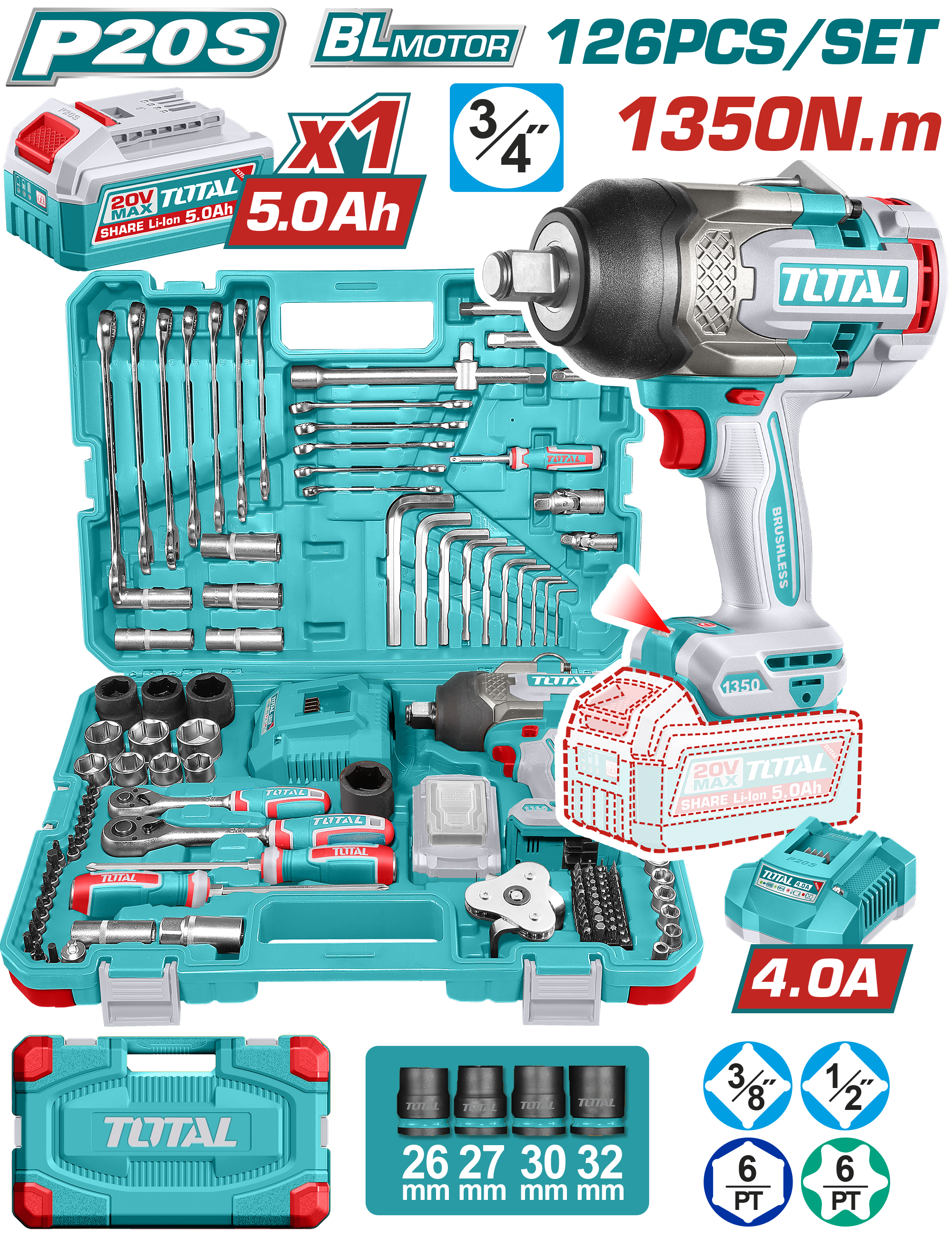 LLAVE DE IMPACTO A BATERIA 20V 1350NM CON HERRAMIENTAS (126PZS) - BAT/CAR - THKTHP31262 - TOTAL