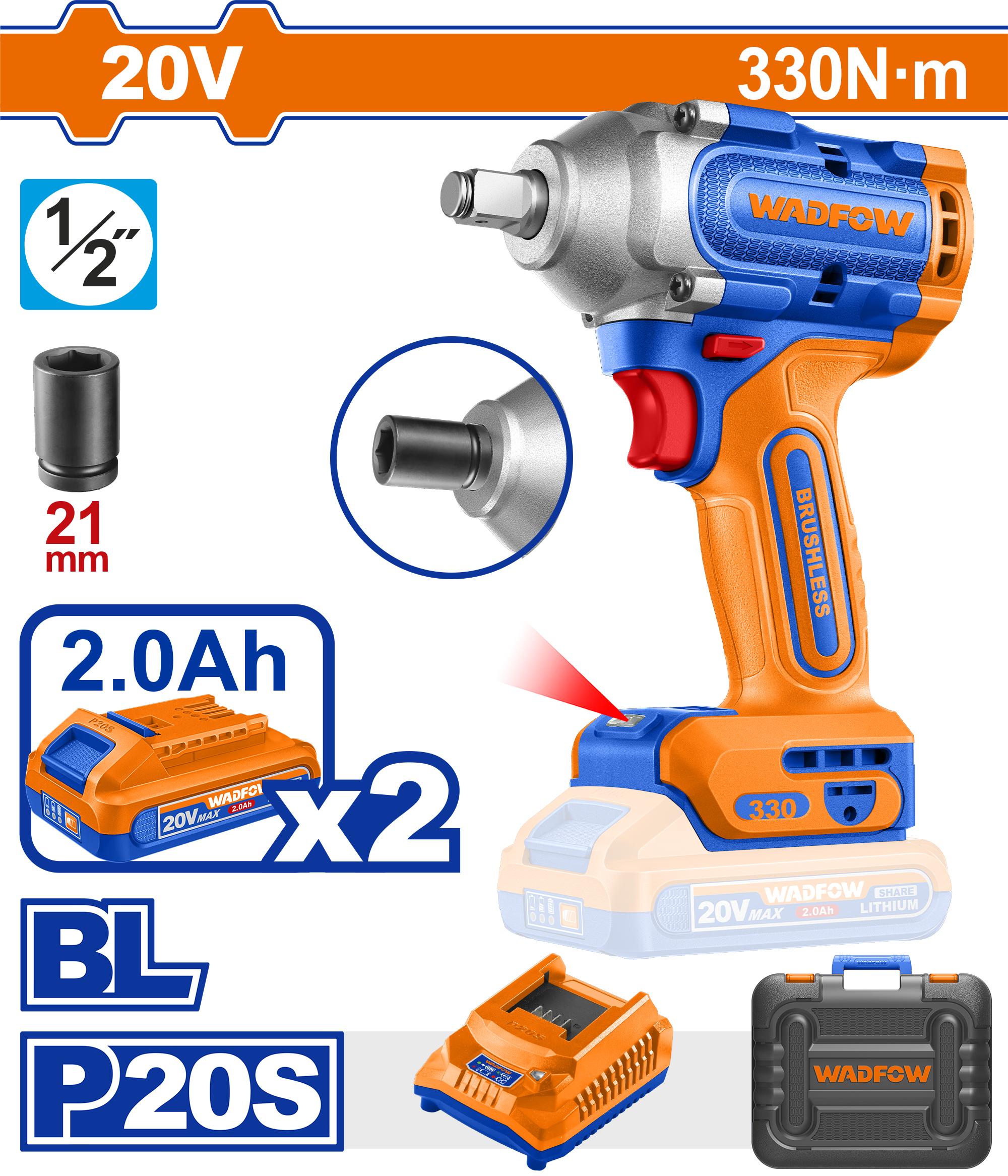 LLAVE DE IMPACTO A BATERÍA 20V 330NM BL - 2BAT/CAR - WCD1B33 - WADFOW