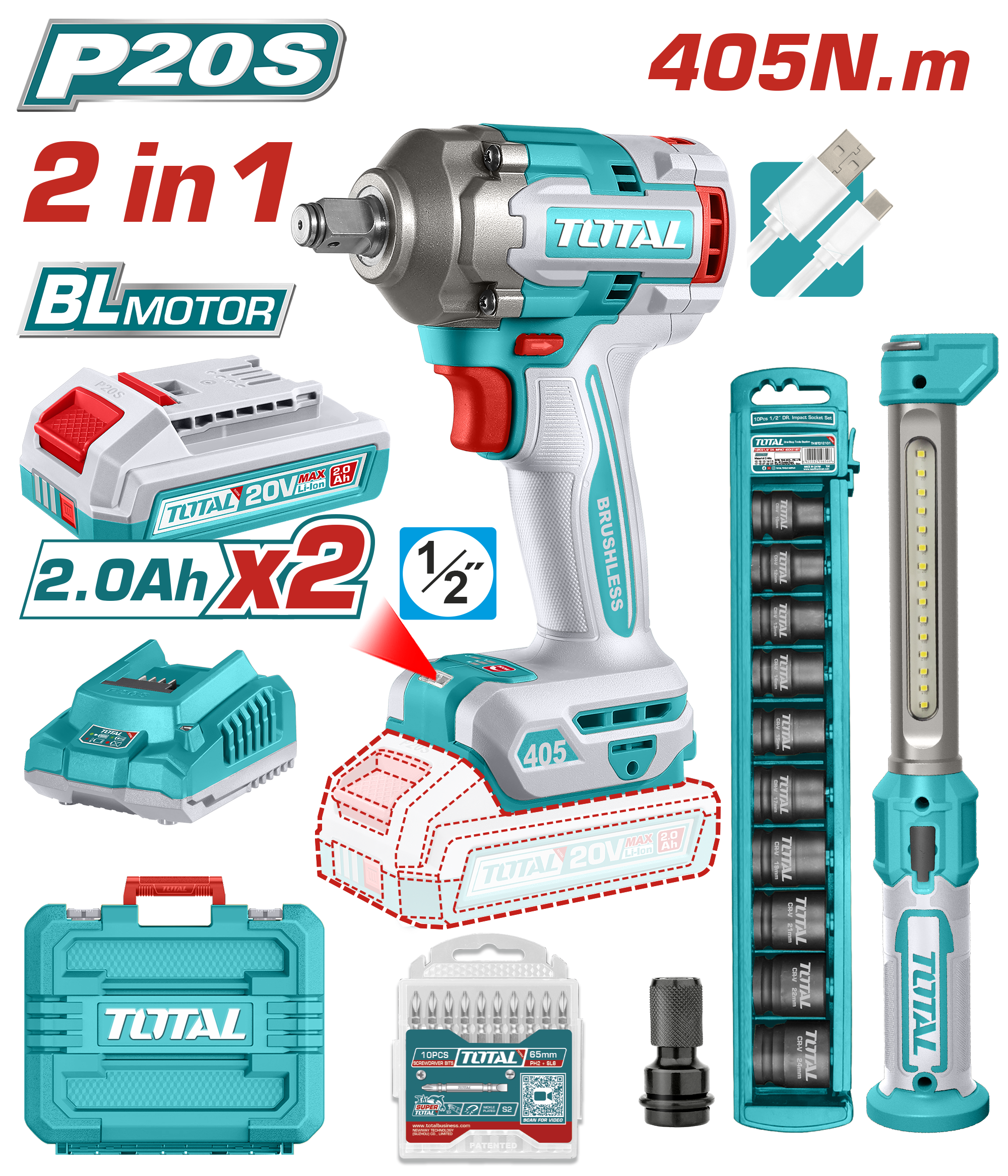 LLAVE DE IMPACTO A BATERIA 20V 405NM BL (KIT LAMPARA) - TOSLI23056 - 2BAT/CAR - TOTAL
