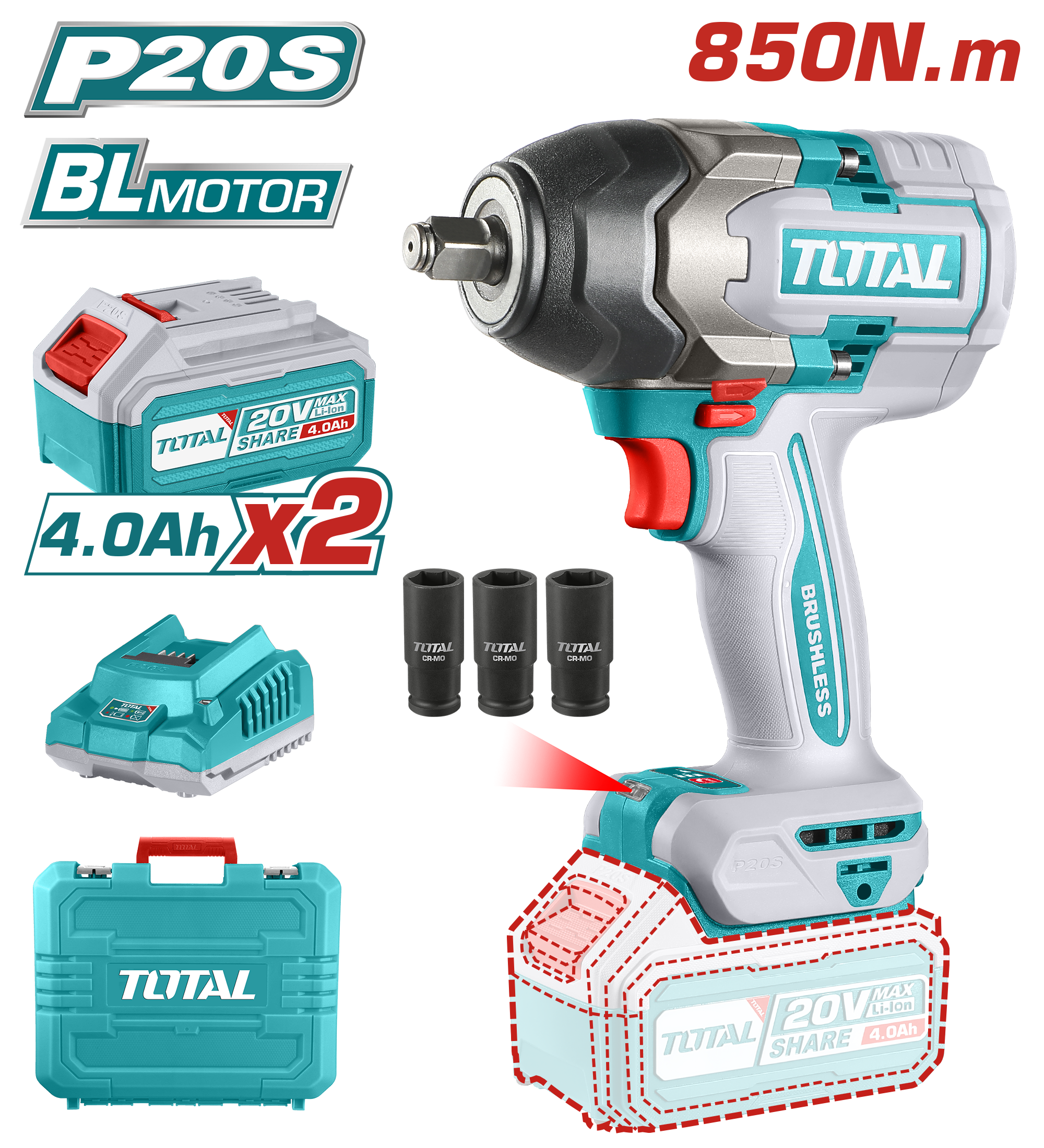 LLAVE DE IMPACTO A BATERÍA 20V 850NM BL - 2BAT/CAR - TIWLI2085 - TOTAL