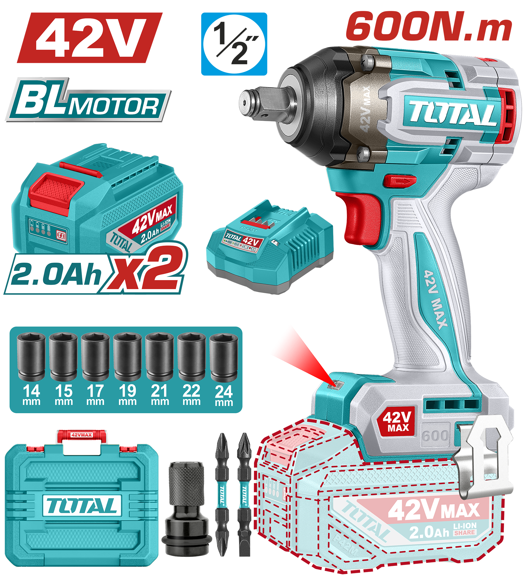 LLAVE DE IMPACTO A BATERIA 42V 600NM BL - 2BAT/CAR - TIWLI42602 - TOTAL