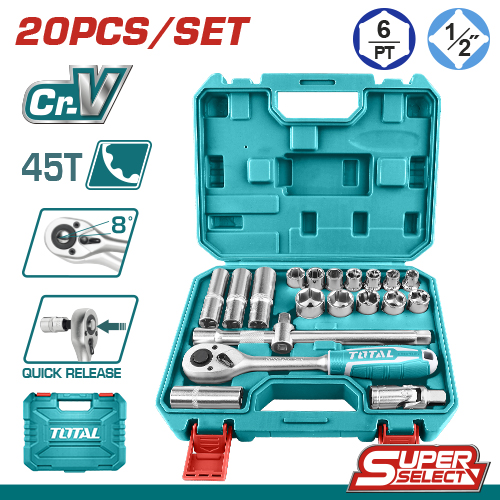 MALETÍN CON LLAVE CRIQUET (CARRACA), LLAVES TUBO Y ACCESORIOS 1/2 (20 PZS) - CRV - TOTAL