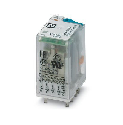 Relés industriales enchufables con contactos de potencia, 4 contactos inversores, llave de prueba, LED de estado, diodo de libre circulación, indicación mecánica de posición de conmutación, polaridad A1+, A2-, tensión de entrada: 24 V DC