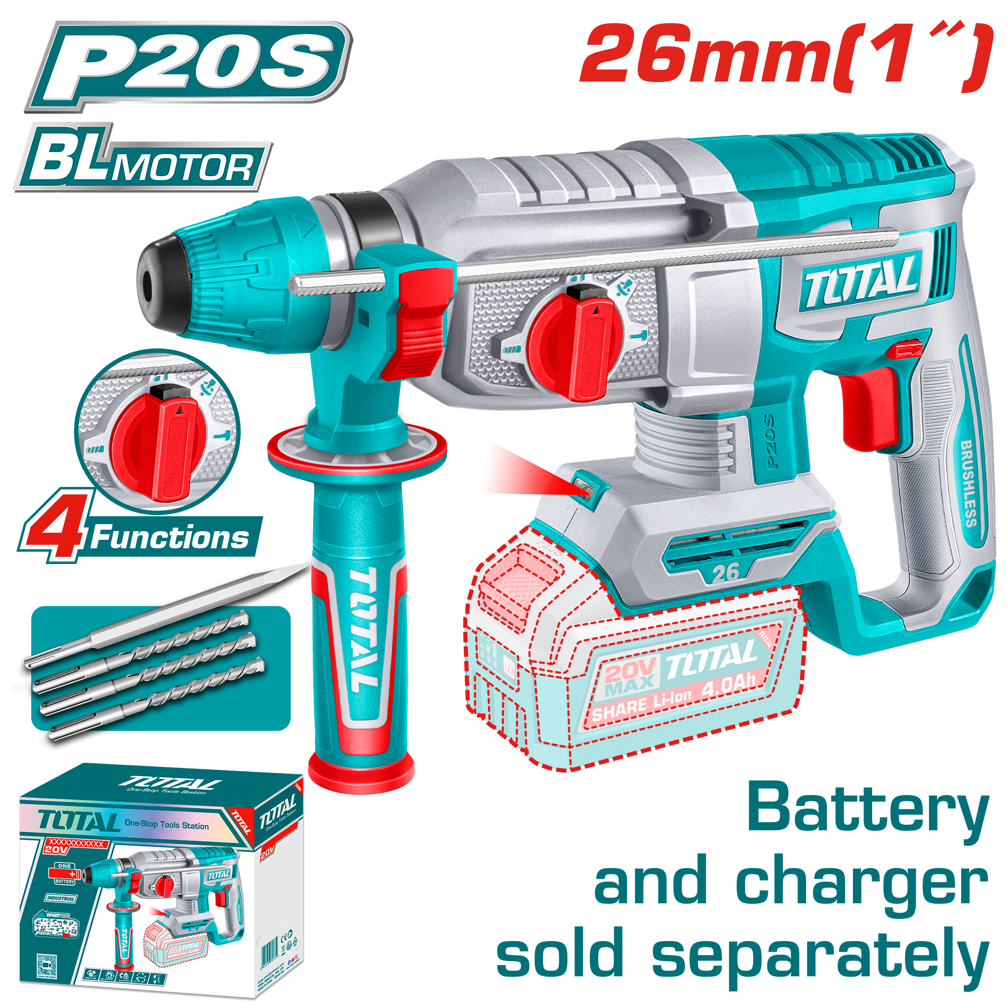 ROTOMARTILLO A BATERIA 20V 26MM BL - SIN BAT - TRHLI26208 - TOTAL