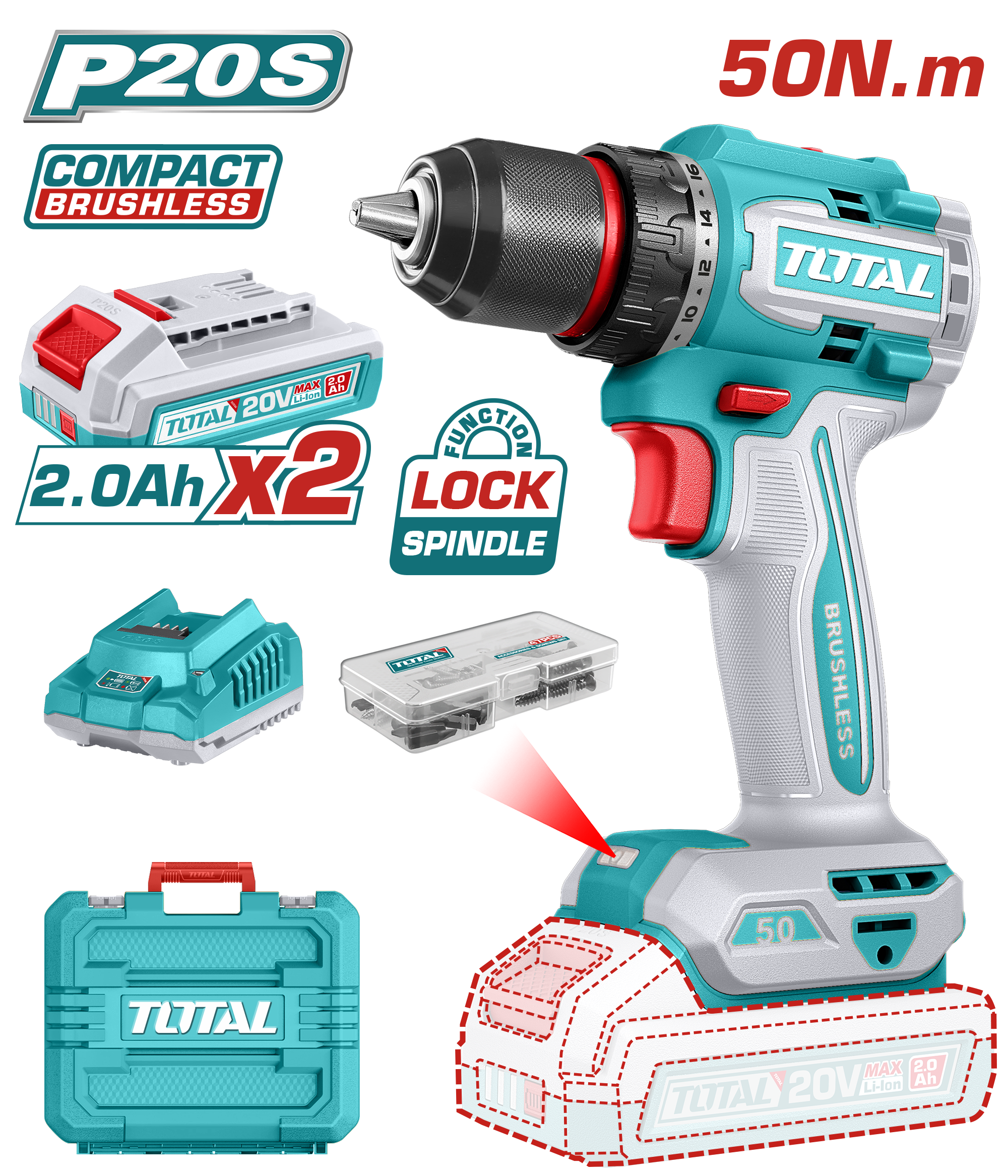 TALADRO ATORN A BATERIA 20V 50NM BL - 2BAT/CAR - TDLI205062 - TOTAL