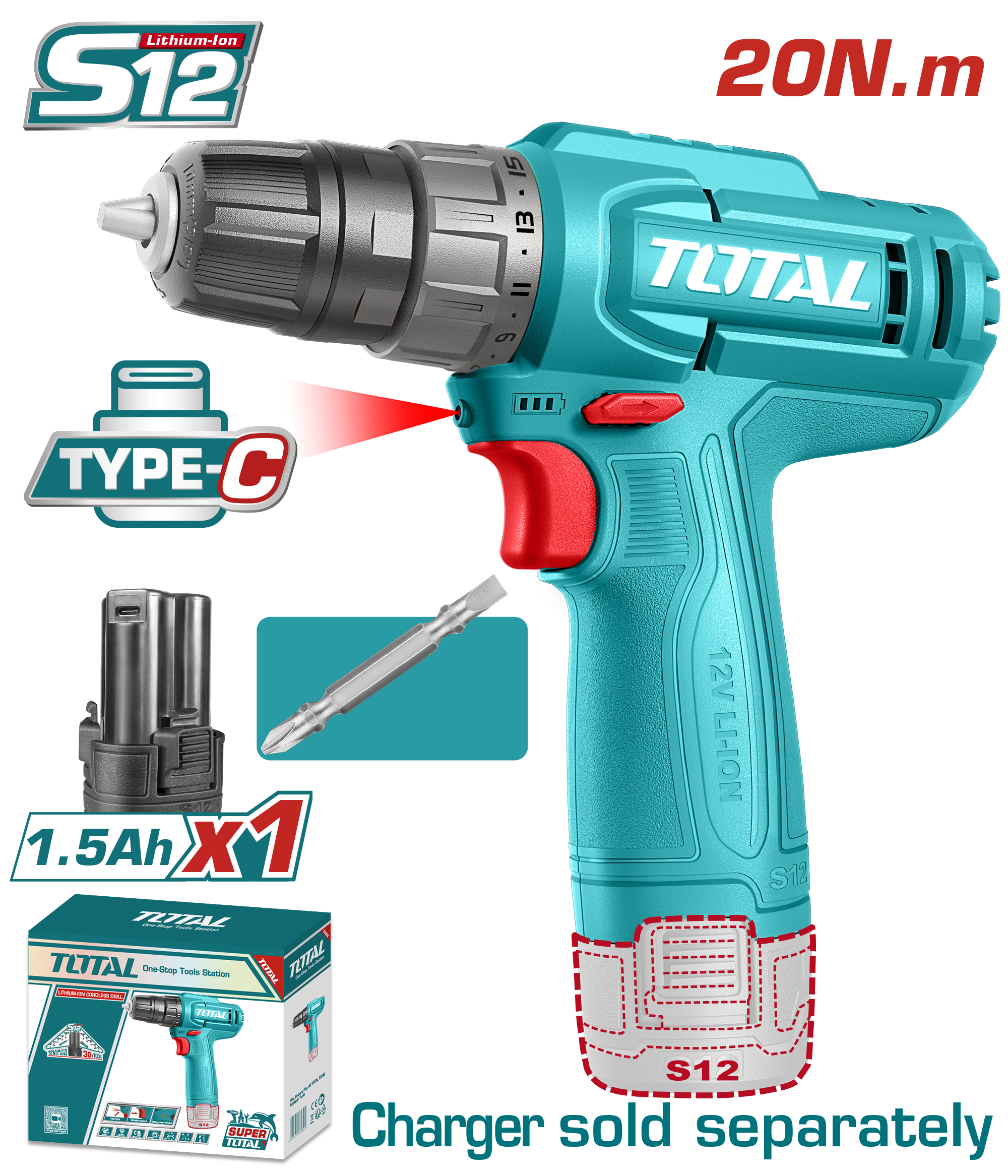 TALADRO ATORNILLADOR A BATERÍA 12V (TIPO C) 20NM - BAT - TDLI12456 - TOTAL