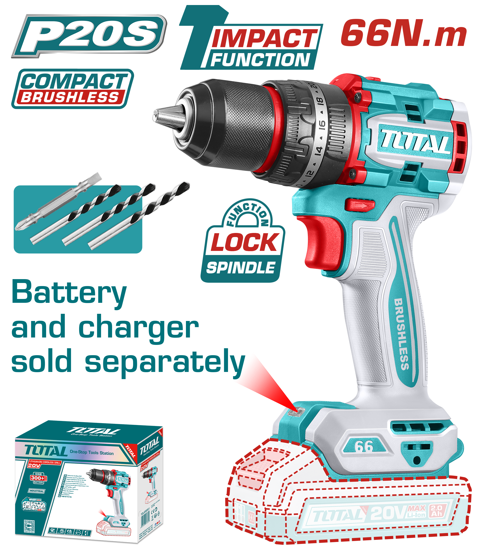 TALADRO DE IMPACTO (PERCUTOR) A BATERIA 20V 66NM (COMPACTO) BL - SIN BAT - TIDLI206681 - TOTAL