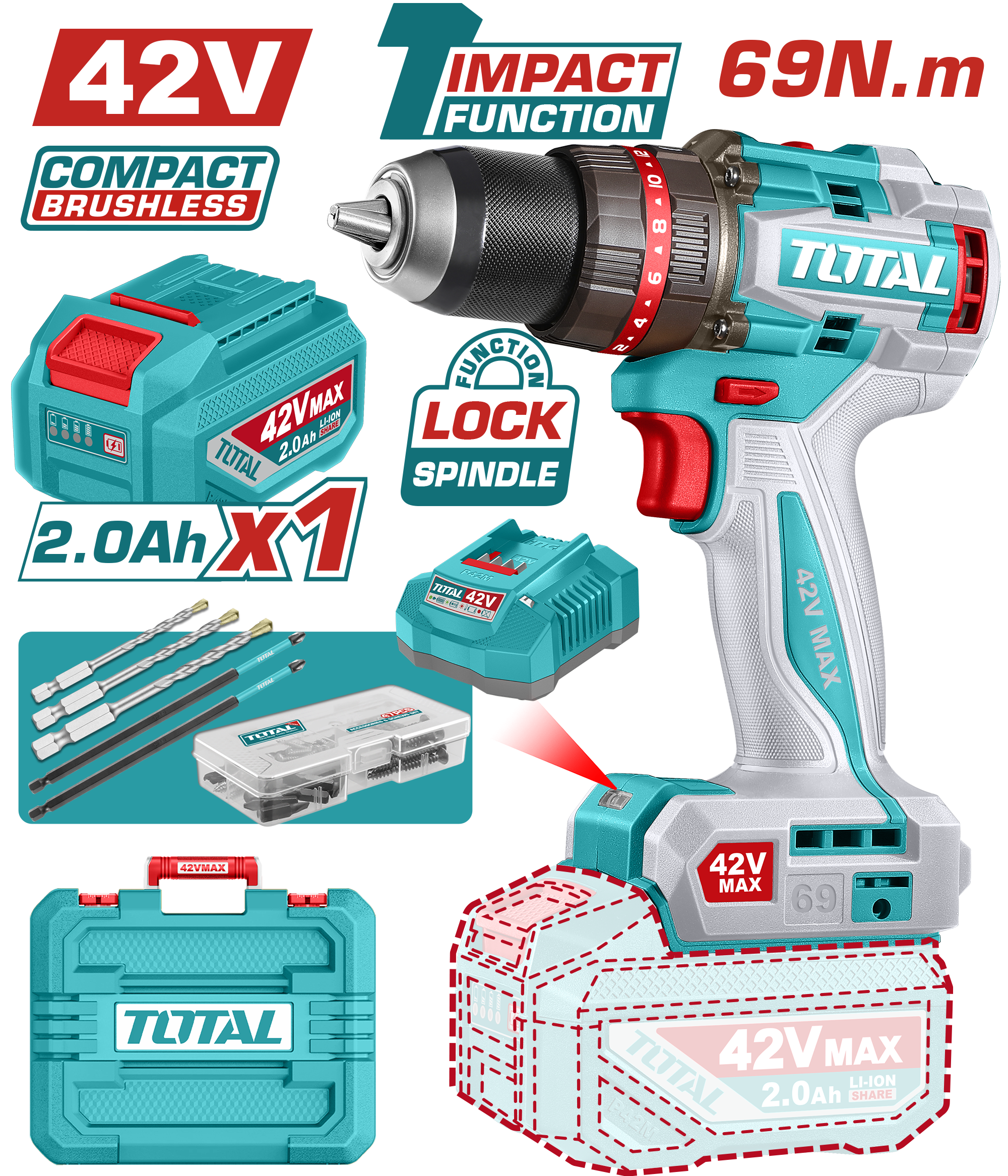TALADRO PERCUTOR A BATERÍA 42V 69NM BL - BAT/CAR - TIDLI426981 - TOTAL